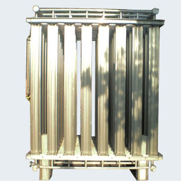 換熱器主要由高效換熱的低溫鋁合金縱向翅片管組成,每個(gè)翅片管又分為蒸發(fā)段和過(guò)熱段兩個(gè)部分。蒸發(fā)段提供足夠的換熱面積將液態(tài)介質(zhì)轉(zhuǎn)化為氣態(tài)介質(zhì);過(guò)熱段進(jìn)一步加熱氣體,提高出口氣體溫度,從而達(dá)到穩(wěn)定輸配的效果。