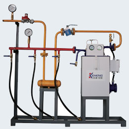 液化氣通過氣化器內(nèi)的換熱器,吸收溫水中的熱量后使之氣化,經(jīng)過本身的氣室使氣液分離脫去重組的部分重新氣化外,氣體輸入管道供給用氣單位(或燃燒器、灶具等燃燒設(shè)備),為用氣單位(或燃燒器、灶具等燃燒設(shè)備)得到一個穩(wěn)定的氣源。溫水的熱源來自電加熱器加熱水,氣化器設(shè)有水溫自控系統(tǒng)將水溫控制在(工作溫度為60±2℃),自控系統(tǒng)會在設(shè)定好的溫度下進行工作。